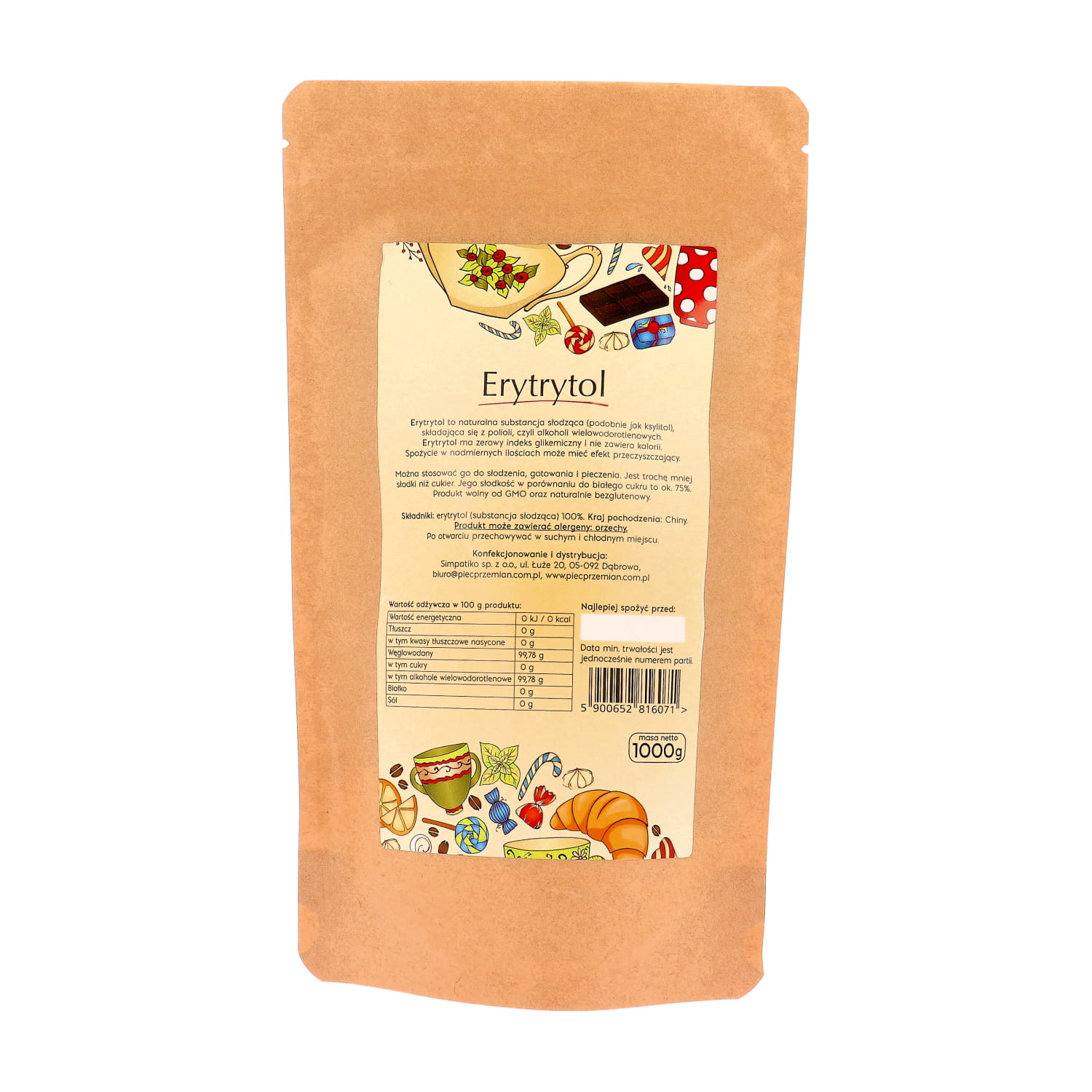Erytrytol to substancja słodząca (podobnie jak ksylitol) składająca się z polioli czyli alkoholi wielowodorotlenowych. Erytrytol ma zerowy indeks glikemiczny, nie zawiera kalorii.