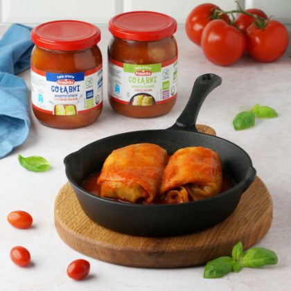 GOŁĄBKI ROŚLINNE Z KASZĄ JAGLANĄ I PIECZARKAMI W SOSIE POMIDOROWYM (53%). PRODUKT PASTERYZOWANY.