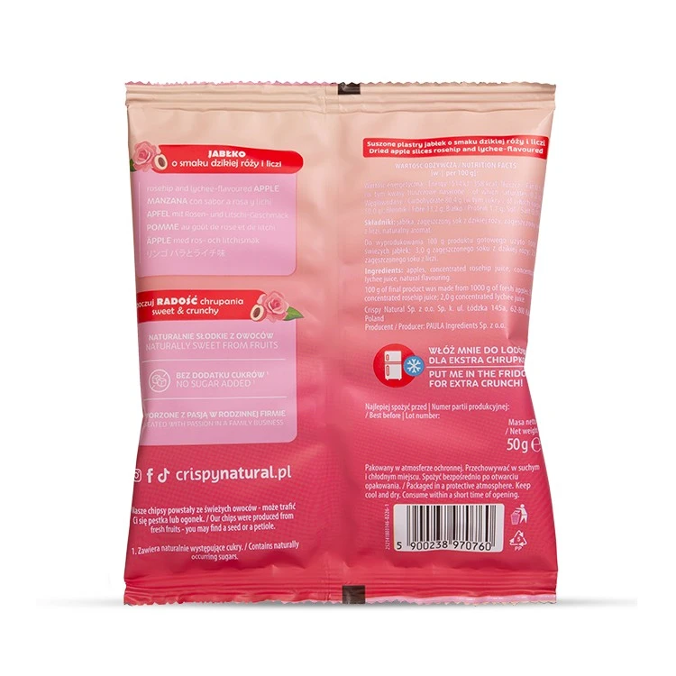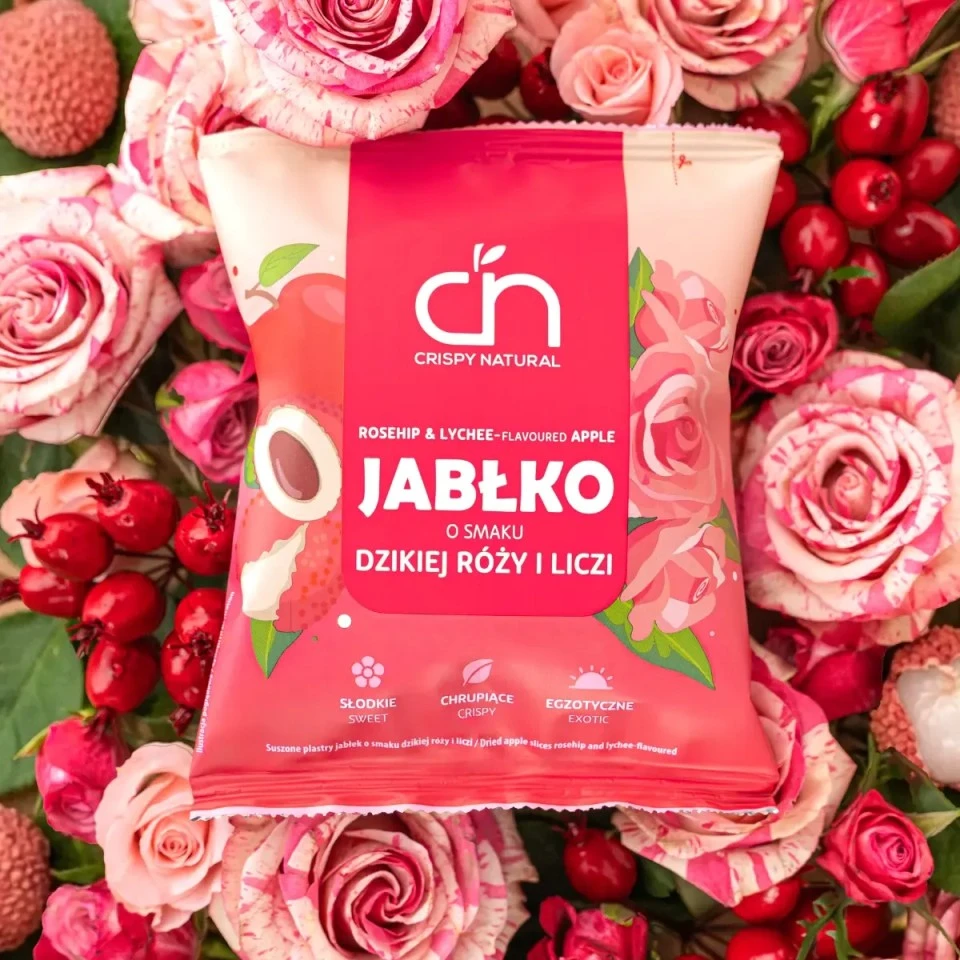 Naturalnie słodkie jabłka połączone z delikatnie kwiatową nutą dzikiej róży i egzotycznym akcentem liczi. Efekt? Chrupiąca przekąska, której nie będziesz mógł się oprzeć!
