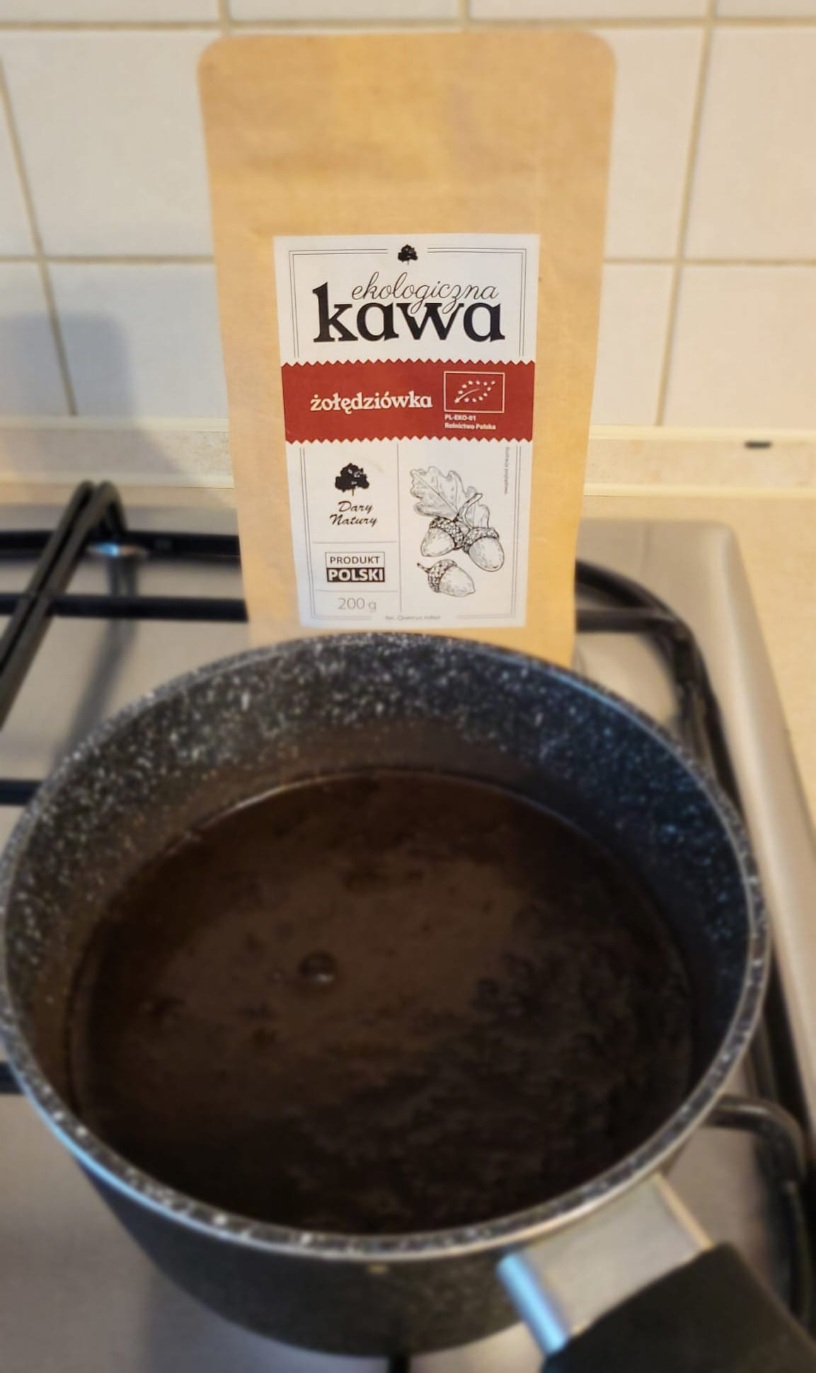 Ekologiczna kawa żołędziówka bezkofeinowa. BIO kawa z prażonych żołędzi to bardzo zdrowy, wzmacniający napój o intensywnym, charakterystycznym aromacie i ciemnej barwie. Nie zawiera kofeiny ani żadnych innych alkaloidów. Daje uczucie sytości, wzmacnia żołądek, wątrobę i śledzionę. Polecana jako zamiennik tradycyjnej kawy oraz element zdrowej, zbilansowanej diety. Zalecana jest przy kuracjach odchudzających gdyż pita na czczo likwiduje uczucie głodu. Może być spożywana przez osoby w każdym wieku. Smakuje doskonale zarówno bez dodatków jak i z mlekiem i syropem korzennym.