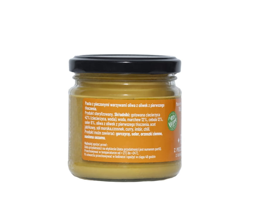 Składniki: gotowana ciecierzyca 42% (ciecierzyca, woda), woda, marchew 12%, cebula 12%, seler 6%, oliwa z oliwek z pierwszego tłoczenia, ocet jabłkowy, sól morska,czosnek, curry, imbir, chili.