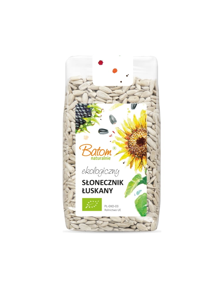 BIO słonecznik łuskany ziarno. Ekologiczne pestki słonecznika to smaczna przekąska a także wyśmienity dodatek do sałatek, musli, posypek.