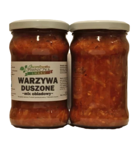 Mix warzyw ekologicznych duszonych w aromatycznym sosie pomidorowym. Szybki i smaczny warzywny dodatek obiadowy.